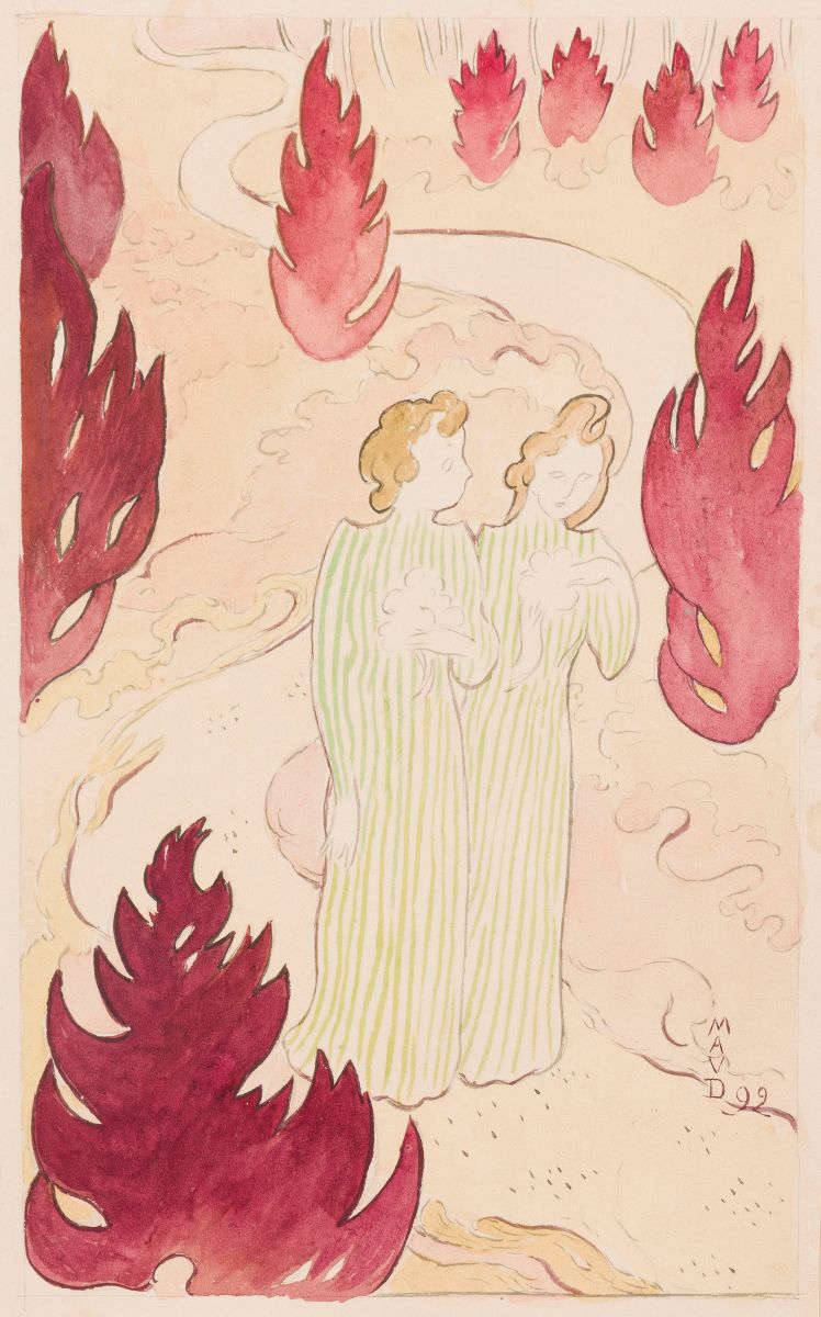 Un motif emblématique de l'année 1892Bien que cette aquarelle ne soit pas directement préparatoire, elle s'inscrit dans une série de variations autour d'un même thème cher à Maurice Denis. Son décor se rapproche de la composition créée pour le frontispice lithographié de Sagesse de Paul Verlaine, témoignant de la proximité entre l'artiste et les poètes symbolistes.