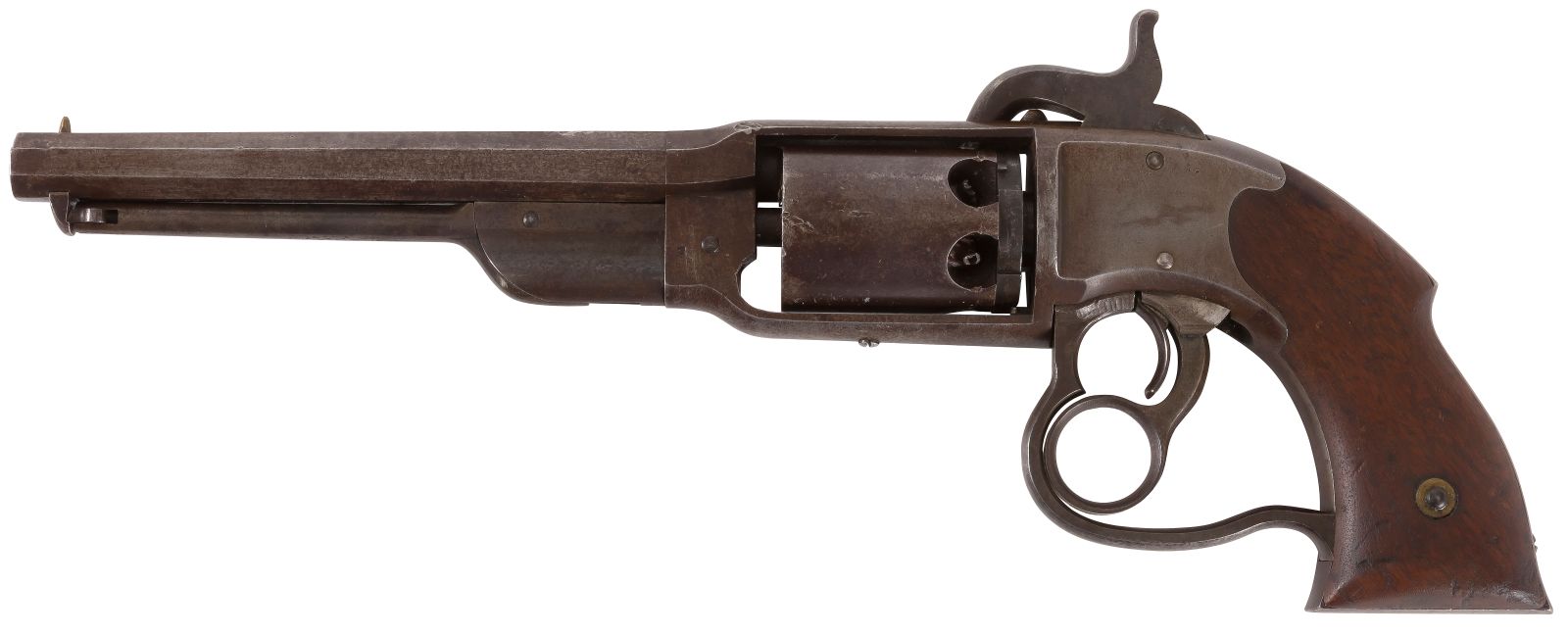 A gauche : Revolver Colt Dragoon, 3e modèle, six coups, calibre 44, simple action (estimation : 3.500 à 4.500 euros) - à droite : Revolver « Savage Navy » à percussion, six coups, calibre 36. (estimation : 800 à 1.000 euros)