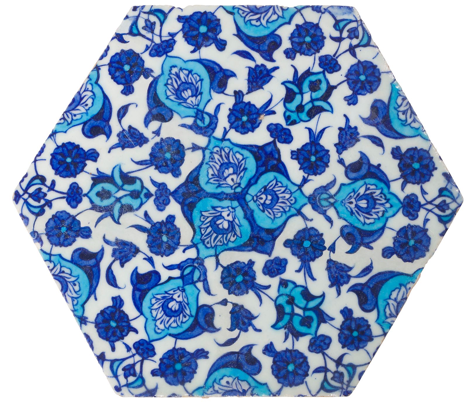 Carreau hexagonal à décor bleu et blanc, Turquie ottomane, Iznik, vers 1520-50. Restaurations et traces d’agrafes.