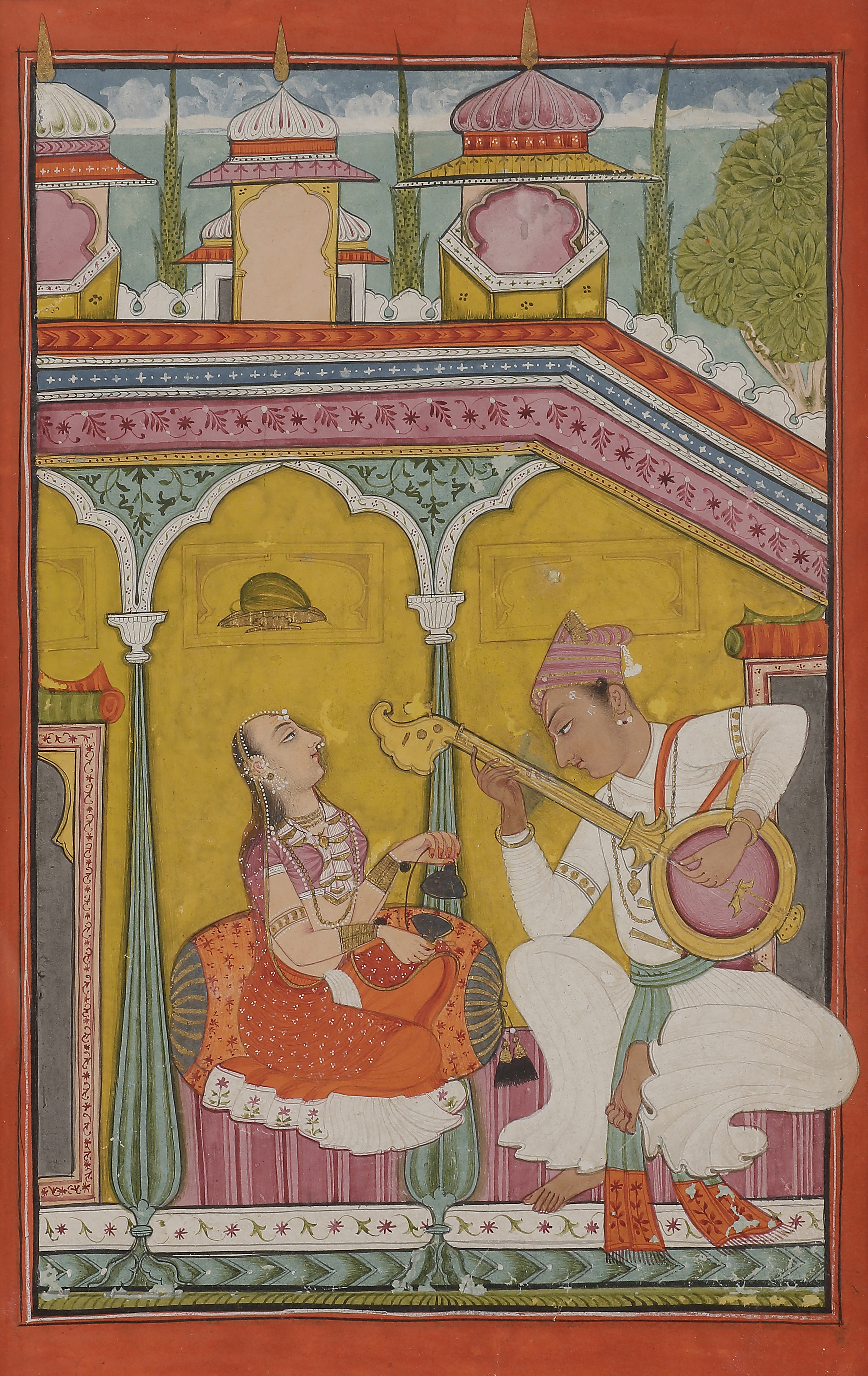 Gouache sur papier, l’homme jouant du tanbura, sa compagne jouant des cymbales, assis dans un pavillon aux murs jaunes safran, dans des bords rouges.