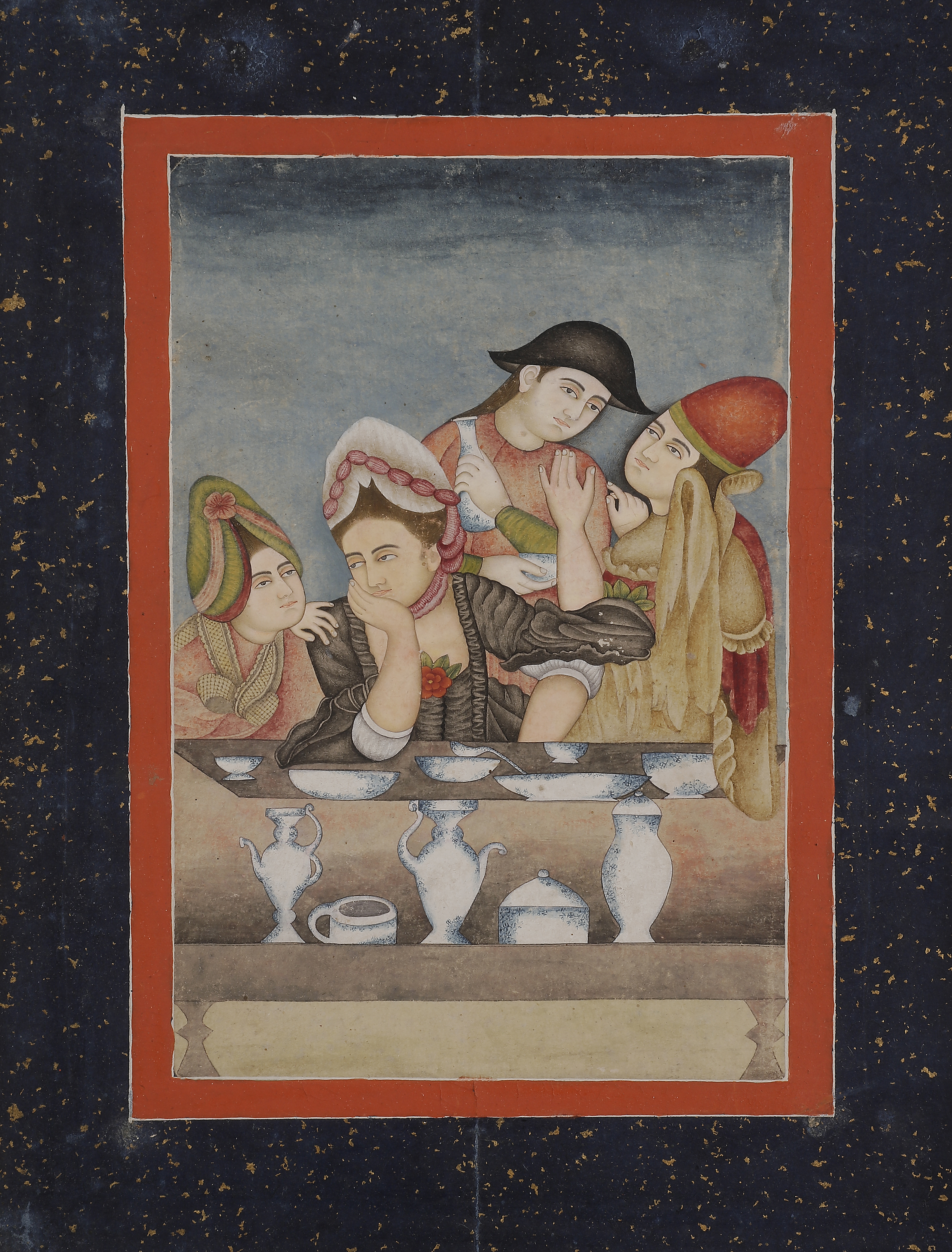 Une élégante européenne à table, Rajasthan, Inde du Nord, vers 1760-80. Aquarelle sur papier représentant une jeune femme européenne accoudée à une table garnie de faïences bleu-et-blanc et entourée de trois compagnons. 32 x 23 cm