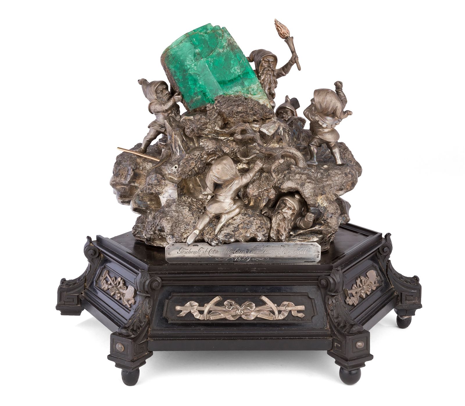 Le présentoir en argent : une pièce d’orfèvrerie chargée d’histoireLe présentoir en argent sur lequel repose l’émeraude a été conçu et réalisé plus tard, sur commande, probablement pour son acquéreur Julius Friedländer. Il représente comme nous l’explique Nicolas Filatoff, l’expert de cette vente, une colline rocailleuse avec des éléments de végétation et six nains creusant des galeries dans la roche. Il faut remonter à la Venise du moyen âge tardif pour comprendre pourquoi les mineurs sont représentés par des nains. Au XIIIème siècle, la République est en Europe la puissance économique absolue. Pourtant dépourvue de terre et de ressources, elle domine grâce au commerce de son artisanat de luxe. Venise a pour cela besoin d’or afin de commercer avec l’Orient, de cobalt et de manganèse pour fabriquer son verre bleu de Murano et ses miroirs blancs dont les artisans vénitiens sont les seuls à posséder le secret. Afin d’aller chercher les minerais essentiels à leur fabrication, Venise organise des expéditions et envoie dans les massifs montagneux allemands, des personnes de petite taille, pour des raisons pratiques, pour se livrer aux travaux de galerie et d’extraction minière. De taille différente, d’aspect inhabituel et se livrant à des activités inconnues des allemands, de surcroît en secret, ils sont considérés comme des sorciers et des créatures dangereuses. C’est ainsi qu’ils deviennent une source d’inspiration pour les contes de la fin du romantisme allemand, dont le plus célèbre est « Blanche neige et les sept nains », paru en 1812.