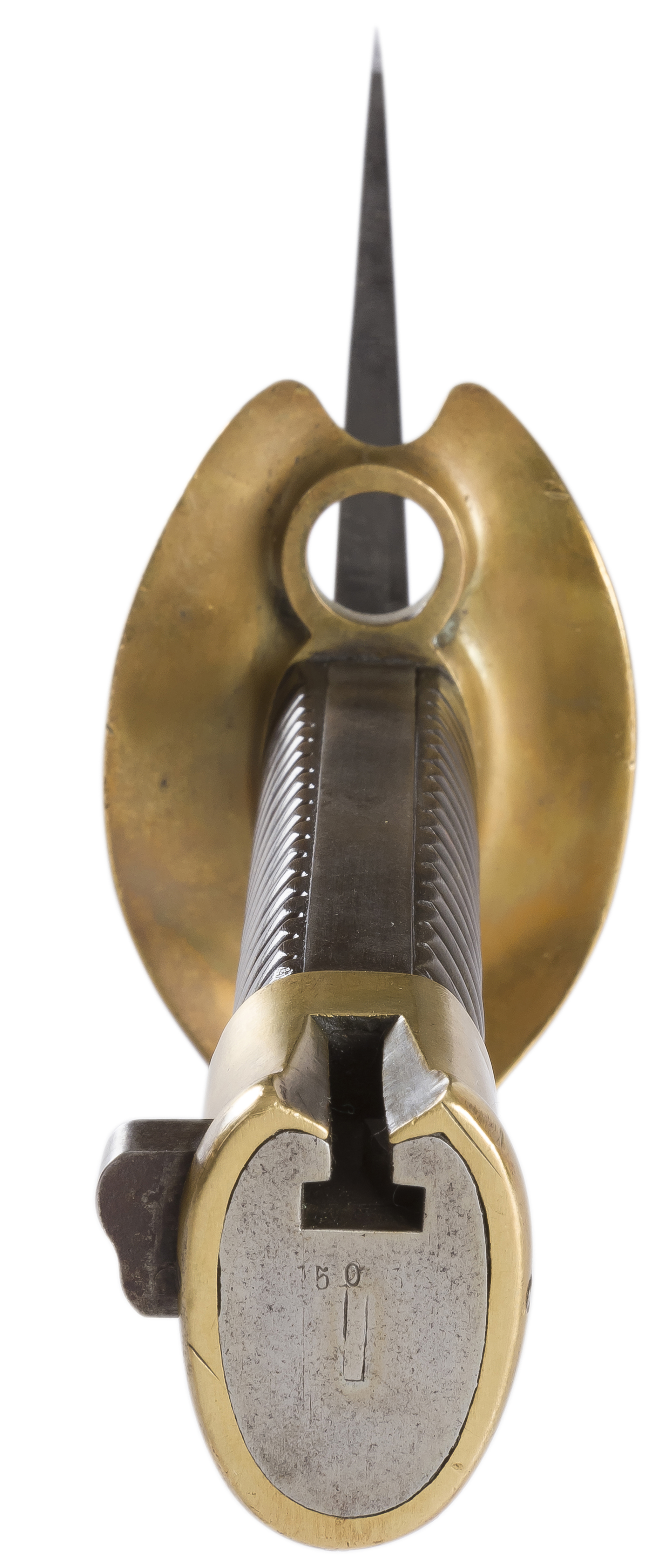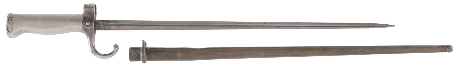 Poignée en maillechort avec rainure latérale pour le passage de la baguette de nettoyage du fusil. Croisière matriculée et poinçonnée. Lame cruciforme poinçonnée. Fourreau en tôle d’acier adapté à la longueur de la lame.