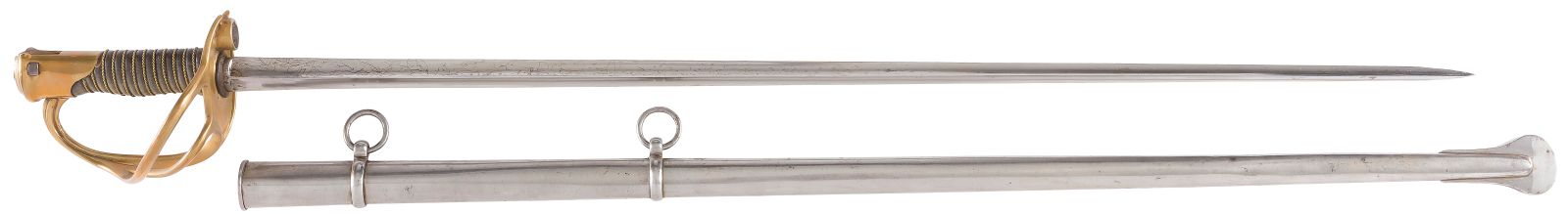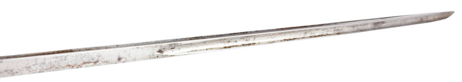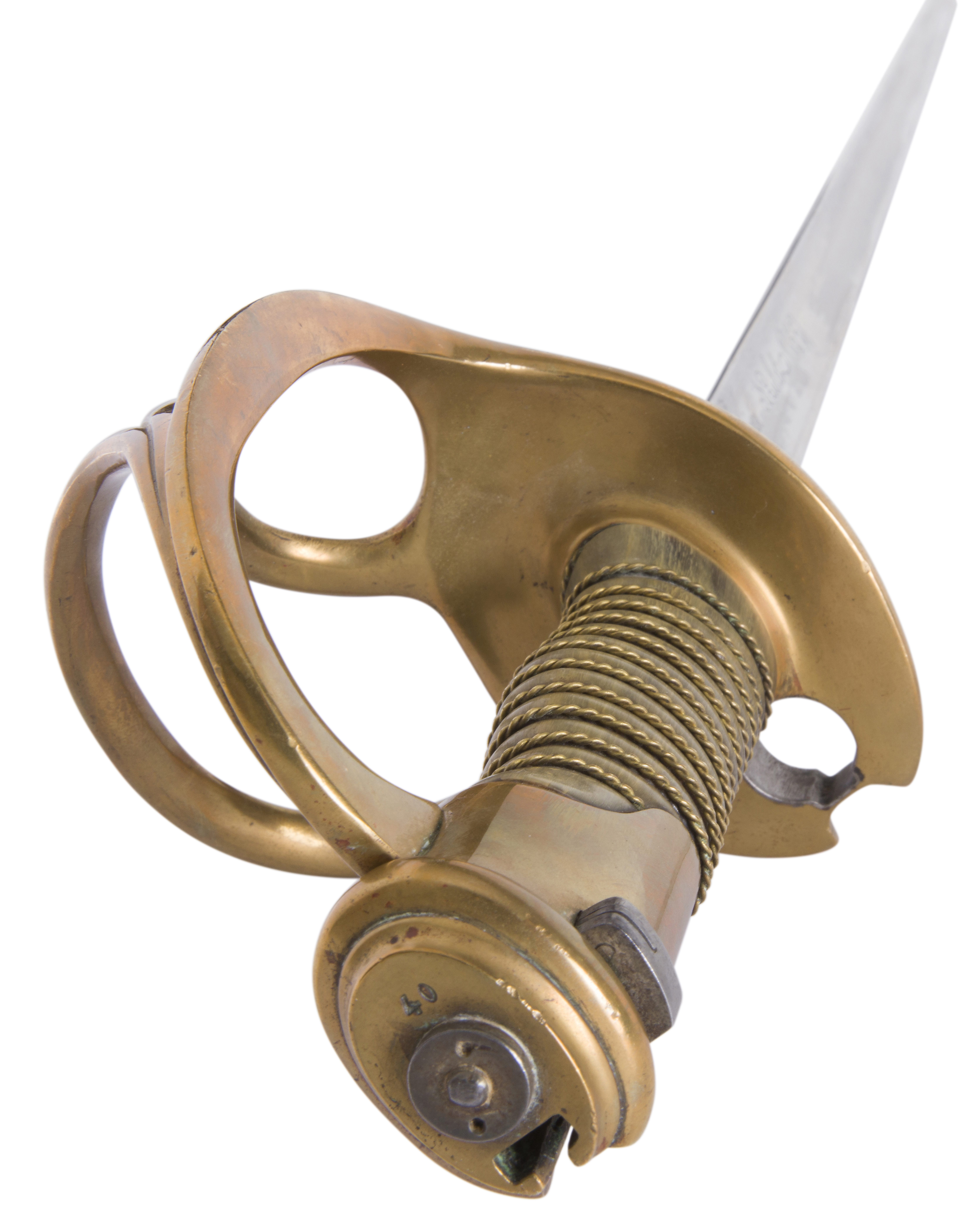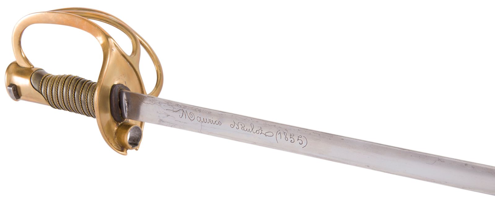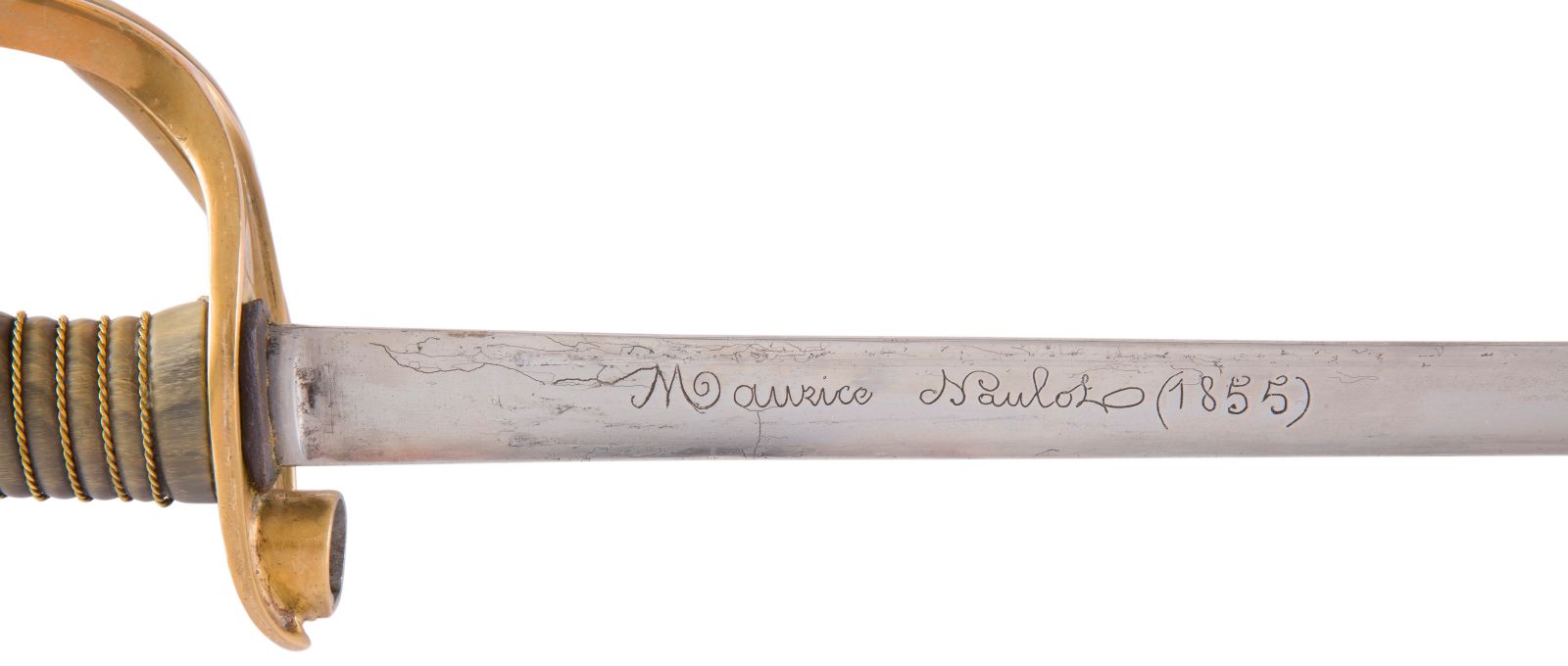Poignée en corne claire avec filigrane en laiton (un petit éclat). Monture en laiton, garde à trois branches. Pommeau frappé « 40 ». Le plateau comporte une douille renforcée d’une bague en acier, et est également frappé « 40 » sous la cravate. Lame droite de section triangulaire à pans évidés (type Préval), poinçonnée et gravée « Maurice Naulot 1855 ».