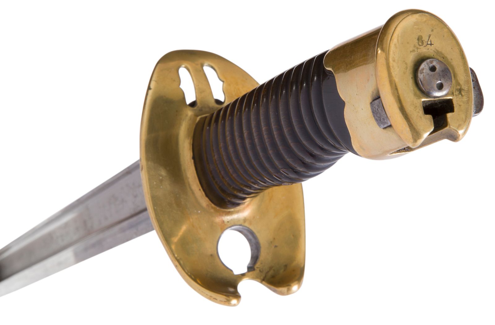 Poignée en maillechort, sans rainure longitudinale, Bouton poussoir de verrouillage, le talon comporte un trou où vient s’encastrer le tenon du fusil. Lame cruciforme poinçonnée « V » et « C » au talon.